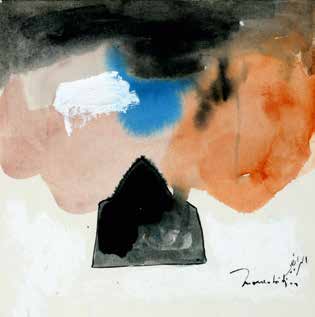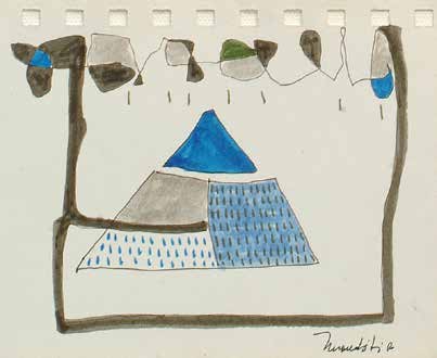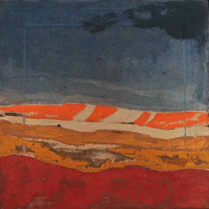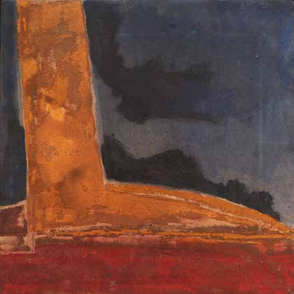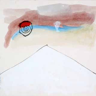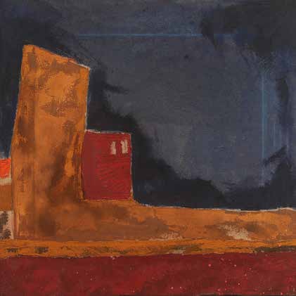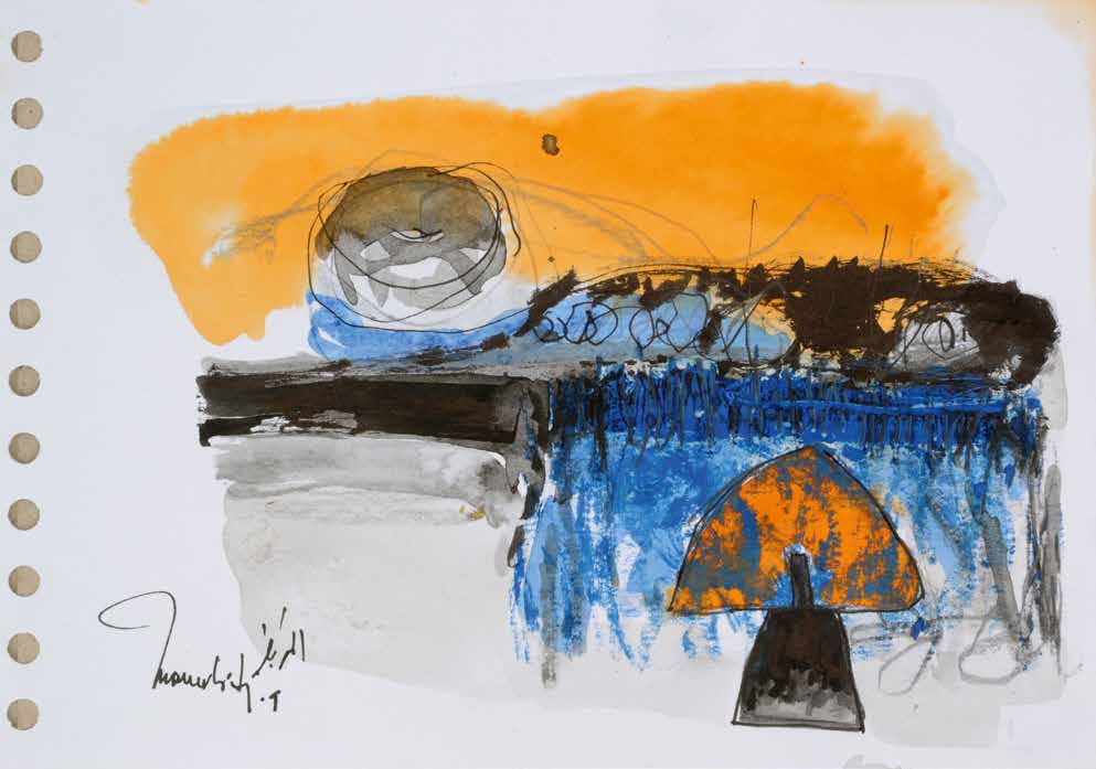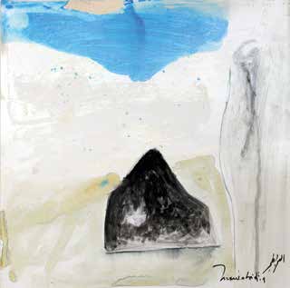 Les expositions de Mohamed sont toujours aussi des sortes de déroulés d’un temps de la méditation sur des toiles soudain renversées, elles semblent passer du sol au mur, du mur au ciel. Elles changent de dimension, se déploient dans l’espace, les unes en résonance avec les autres. Les dessins, très fouillés, répondent aux toiles aériennes et divulguent d’autres éléments non-directement préhensibles. Mais elles forment un ensemble difficilement sectionnable. Dans la série Sur les traces d’Ibn Arabî, la virtuosité du peintre est évidente. Les liens physiques établis entre les lieux représentés dans les toiles précédentes s’éclipsent par moments pour sublimer des ciels. Une figure sombre, parallélépipédique flotte, inaccessible, mais centrale, insistante. Elle semble incarner le tombeau du grand mystique que MOURABITIest avait visité lors d’un voyage à Damas qui l’a ébranlé. Il a retrouvé au fond de sa mémoire, d’autres tombeaux, d’autres généalogies, et ce, dans sa propre famille. Il a lancé encore un harpon vers le Sud, vers le tombeau de l’aïeul.