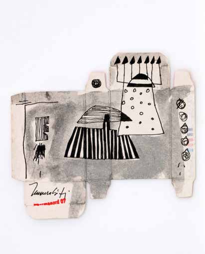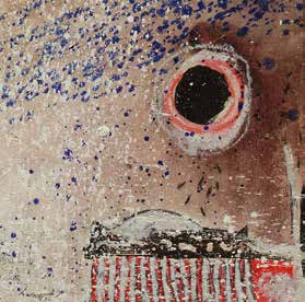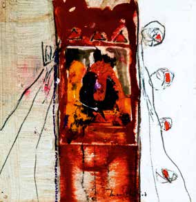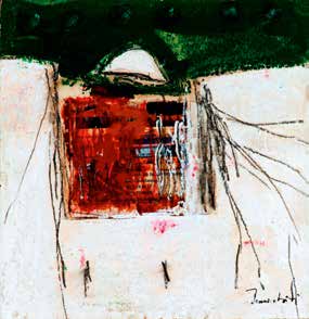 À l’aube du XXIe siècle, le passé et l’ouverture sont ainsi balayés d’un geste, remplacés par une forme de honte. Un coffre noir de honte, un enfermement. La peinture de Mohamed MOURABITI semble nous raconter tout cela, il nous parle de dématérialisation : celle de la spiritualité d’une époque vidée de son sens. Il formalise des seuils. Entre le monde inférieur et supérieur, dont il montre les médiations permises ou suspendues. Entre le profane et le sacré, les Marocains cherchent maintenant à séparer les deux sphères qui, de toujours, étaient imbriquées dans la société.