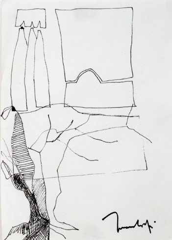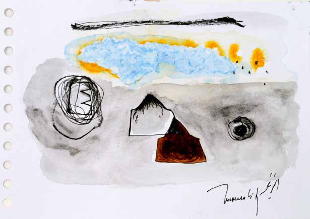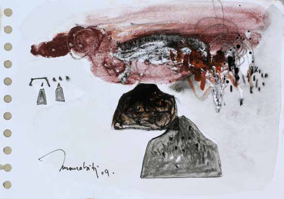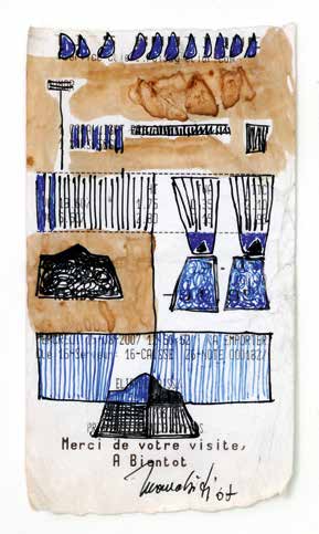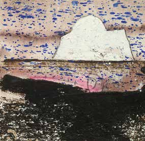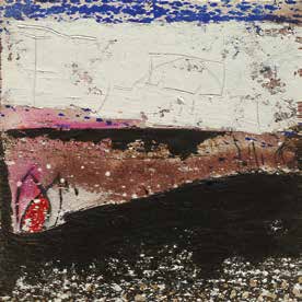 Ancré dans un territoire qu’il domine, MOURABITI nous parle toujours du lointain. Sa peinture nous transporte loin, par petites touches. Réminiscences. Quelques notes semblent jetées sur le papier, un son mélodieux en arrière-plan, évocations. Des morceaux de papier peuvent être découverts, sous un glacis blanc, des flèches, des cercles, de petits bouts de cartes de ville sont parfois marouflées sur les toiles et sont retravaillés.