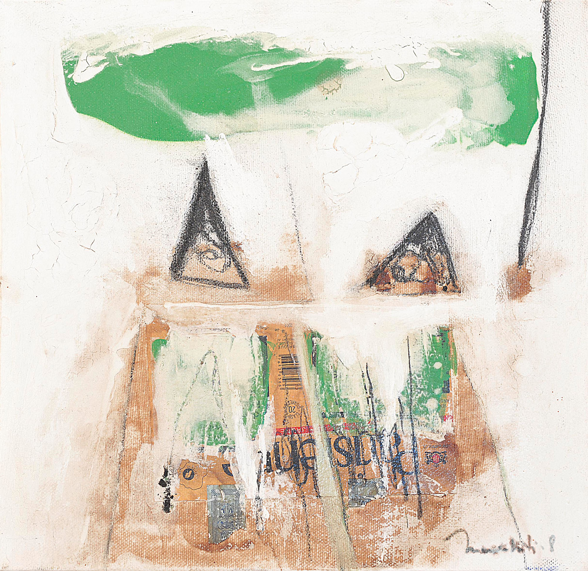 En fait, les paraboles dressées, telles des girouettes, dans des champs de blé, rythmaient la cadence visuelle de l’artiste et s’infiltraient pour devenir un jour le leitmotiv récurent de sa gestuelle intime. Elles commencent par faire leur apparition à l’état anecdotique puis elles se sont purifiées, stylisées, avant de s’abstraire pour ne demeurer que trace rappelant le trait d’un événement qui fut un jour.