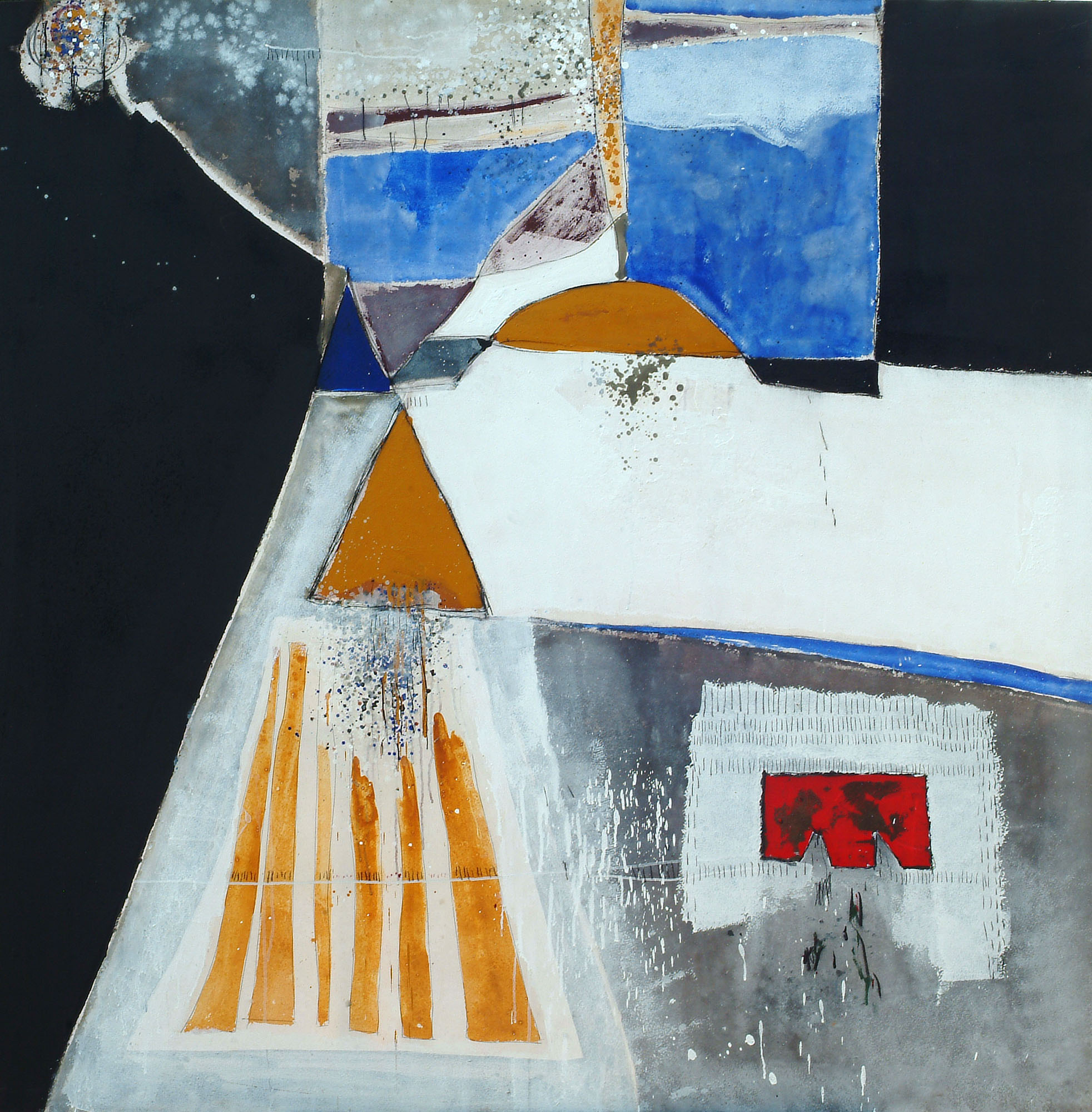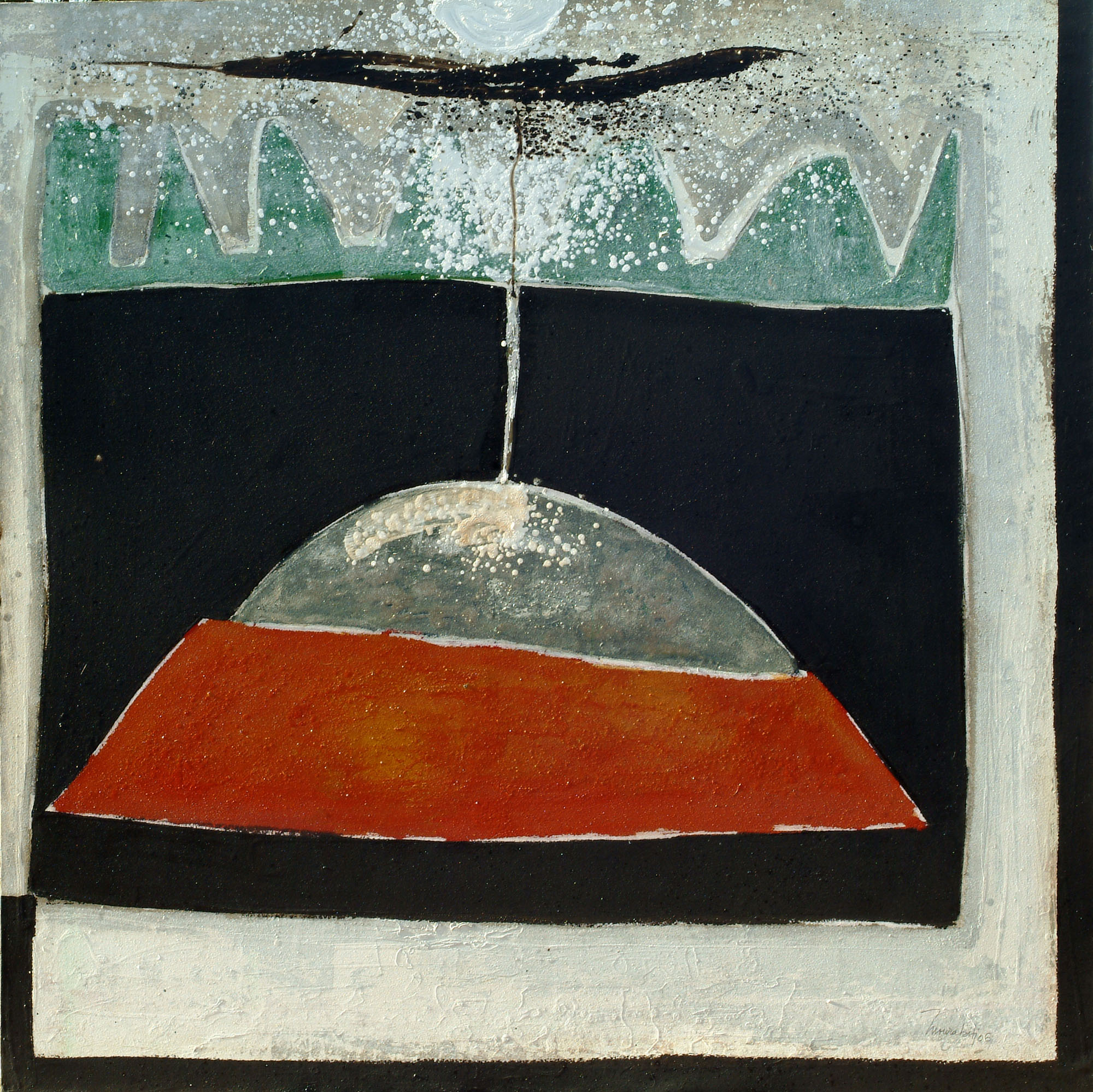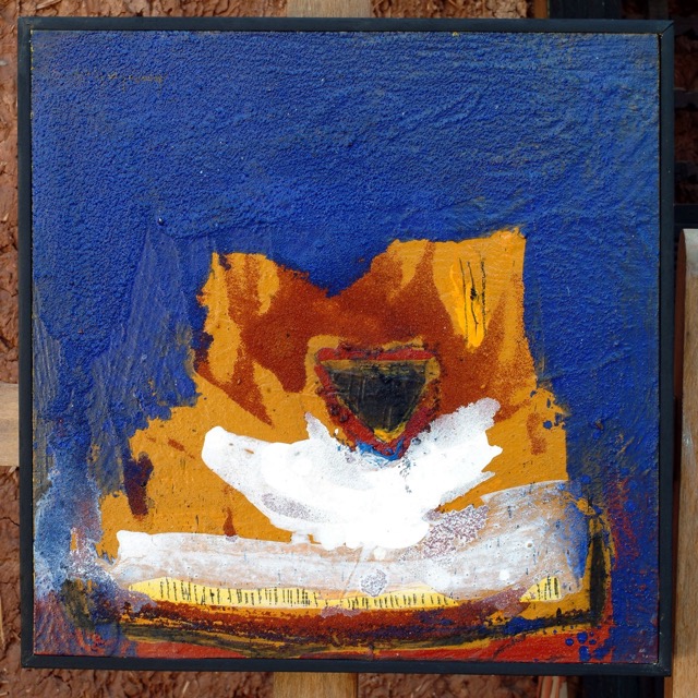 Cette abstraction de la forme parabolique (dans tous les sens de l’image), s’accompagna d’une introduction de la terre. En fait Mourabiti travaillait à partir d’un référent terrestre, celui du rappel du mur de la ville du Sud, en l’occurrence le pisé ; mais la terre à laquelle je fais ici allusion, relève de Physis au sens grec. L’artiste vit au sein de la terre, il la hume, il la pratique, il la pétrit et la construit. On dirait que, à la manière des alchimistes, il cherche un paradoxe combien délicieux en art, et nulle part ailleurs : s’enfoncer dans la terre et interroger la technologie.
