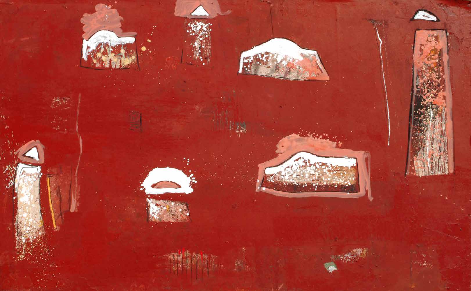 Son travail est pure réminiscence. C’est le retour de toute son enfance à Marrakech : les rues étroites, la perspective des murs, le jeu de l’ombre et de la lumière. A cela s’est ajoutée aujourd’hui sa relation à la terre et à la nature. Il vit au pied de la montagne, à Tahanaout. Là, devant l’immensité de la Terre, l’environnement est devenu une composante plastique essentielle de sa peinture.