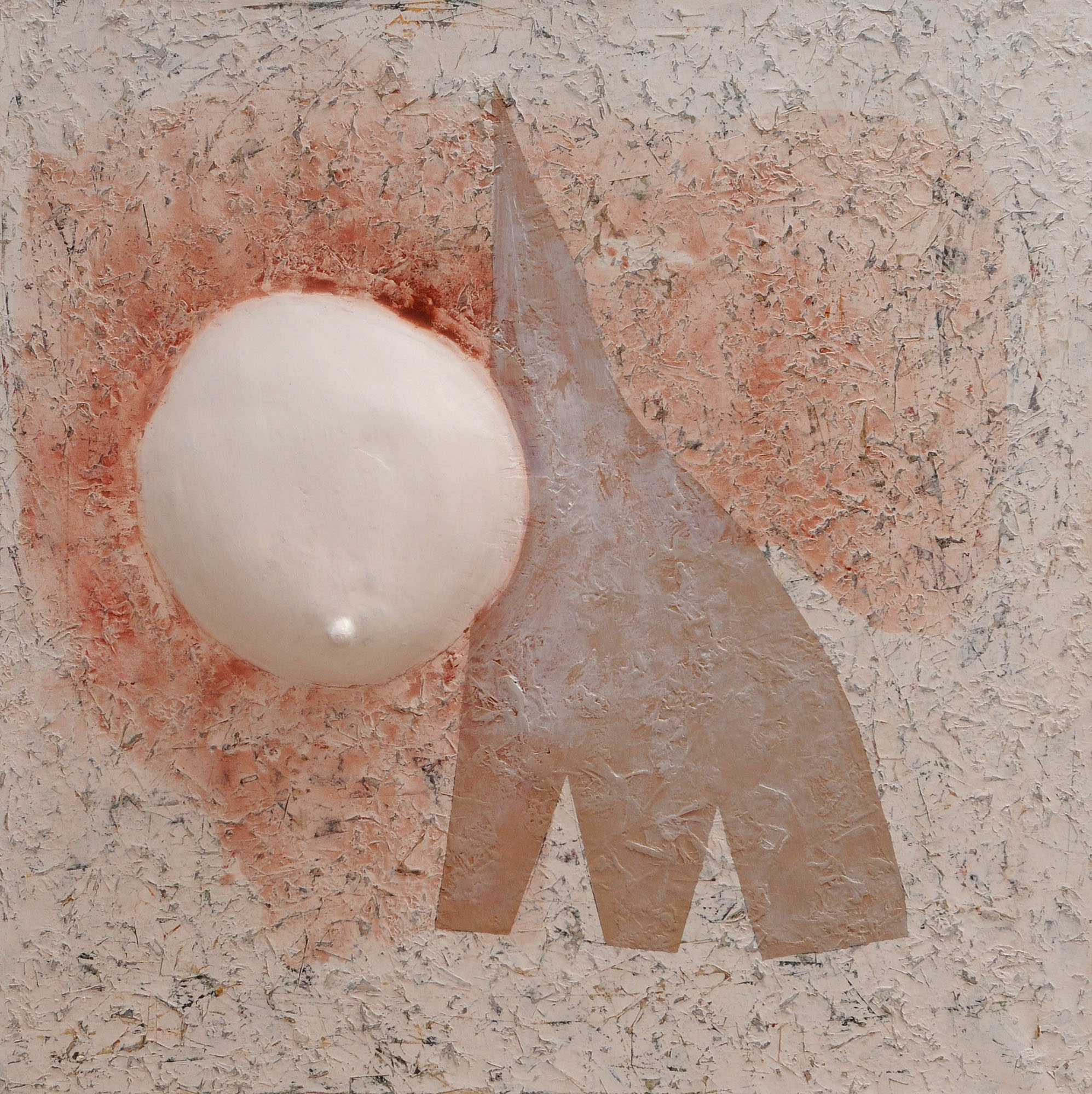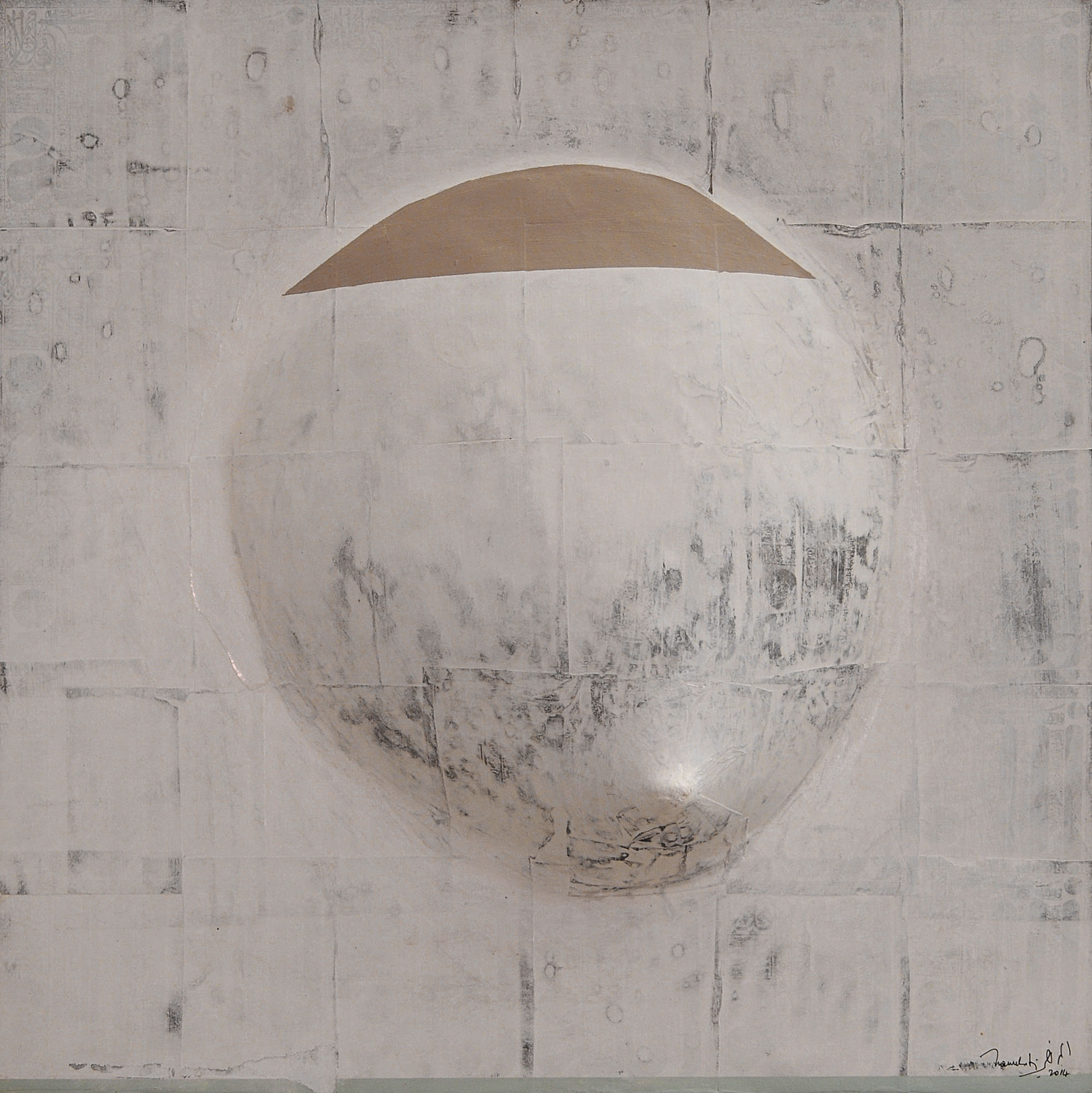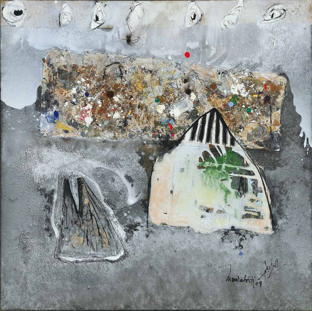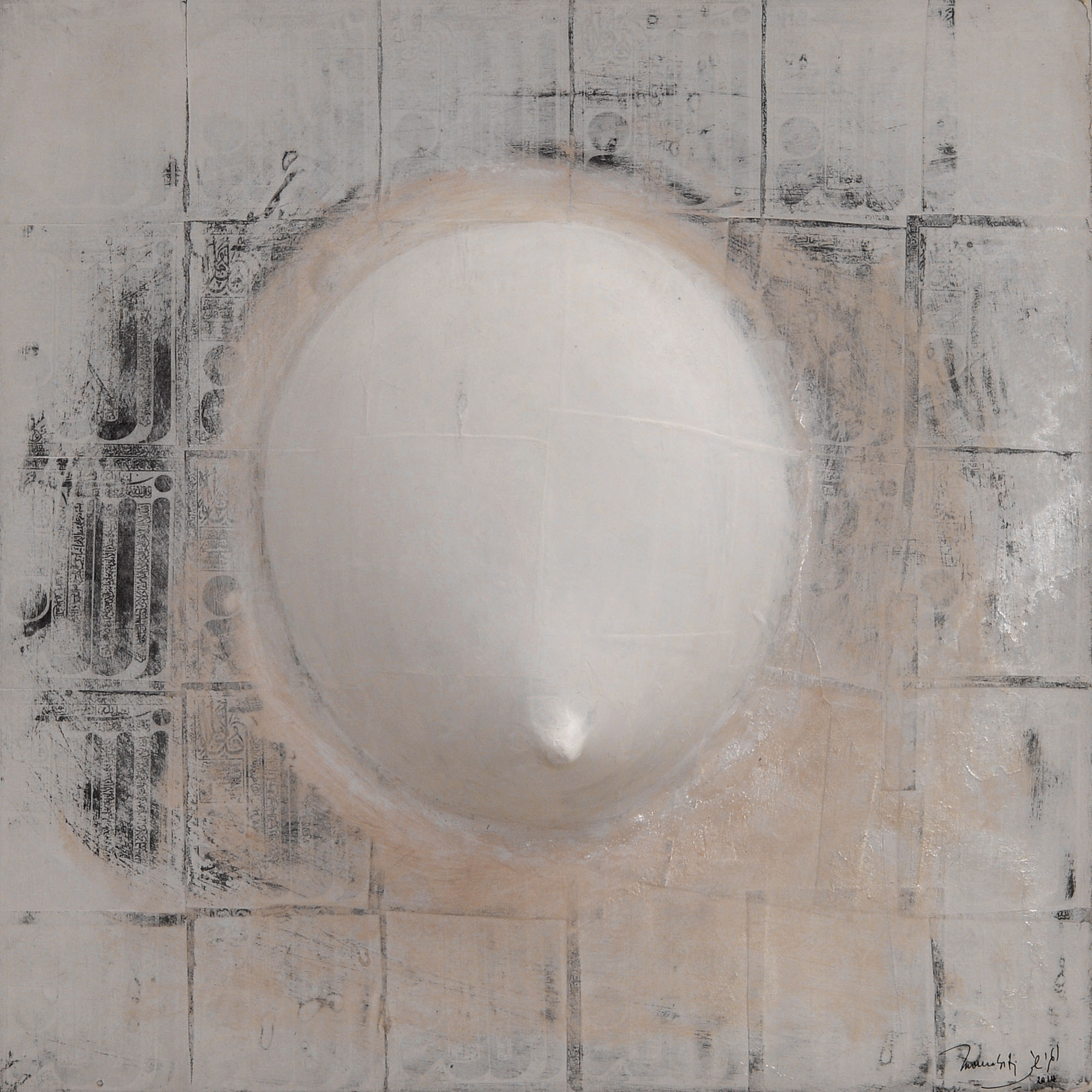 On peut dire que par rapport aux travaux, réalisés autour des années 2006 et qui furent l’objet d’une exposition, un grand pas décisif a été franchi. Non pas que ces œuvres fussent mauvaises. Loin de là. Elles traduisent plutôt une période de recherches dont l’aboutissement est ce qui se donne à voir maintenant. Dans les grandes toiles que j’ai pu voir, la vision de Mourabiti s’est affirmé dans le champ qu’elle a déterminé. Une patiente et diverse exploration des valeurs esthétiques et poétiques de la matière. La transparence, la blancheur comme tonalité dominante, symbolique de pureté, d’une certaine ascèse et pourquoi ne pas penser à une lointaine imprégnation du soufisme (le blanc de la laine). Mais pour autant les formes qui lui sont chères, constantes comme, par exemple, les cercles, les sphères ou ce qui s’en rapproche n’auront pas disparu et s’intègrent parfaitement dans ces toiles présentes. Il m’est venu à l’esprit, et ce n’est pas une fantaisie gratuite, que les Jbilets sont entrés dans la peinture de Mourabiti d’une manière ou d’une autre. L’éventail des variations autour des formes arrondies des jbilets justifie cette entrée ; c’est encore la matière qui intervient comme mémoire, comme vécu du regard et du corps en sa totalité. Ce n’est là qu’une approche des récents travaux de Mourabiti ; il faut le tenir à l’œil, pour ainsi dire, et ne pas passer trop vite ou sans retour. Klee donnait deux conseils à qui voudrait voir de la peinture. Prendre une chaise et laisser l’œil suivre ça et là les chemins tracés par le peintre dans ses toiles. Chose faite ! J’attends avec impatience la consécration à venir au cours de cette exposition