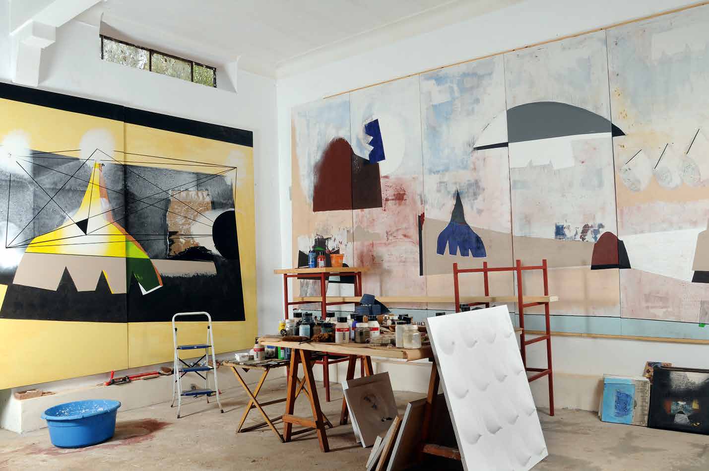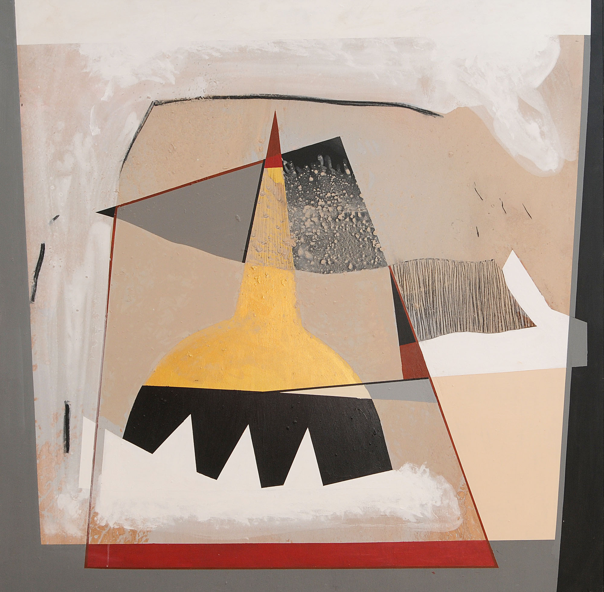 Peut-être cela n’est il pas si innocent que cela et qu’il y aurait un certain rapport avec ce qui va s’ensuivre au cours de cette visite. A peine arrivés, accueillis par l’homme de confiance Si Abderrahmane, qui assume la responsabilité des lieux, durant l’absence de Mourabiti ou de son frère, l’alerte a été donnée… Plus simplement, Mohammed Mourabiti, informé de notre arrivée, allait aussitôt, de la Maison des Arts à Paris où il effectue un stage, donner des instructions pour qu’on nous ouvre et qu’on nous accueille dans sa belle demeure comme s’il était présent parmi nous… Le geste d’une amitié chaleureuse, constante, affirmée en tant d’occasions et qui évidemment ne pouvait manquer de me toucher une fois de plus. Et particulièrement, cet accueil, d’amitié, même en son absence, allait me permettre de vivre une belle et singulière expérience. Et d’abord cette belle demeure qui est son œuvre, le fruit de sa vision, aussi bien du point de vue de l’architecture que par l’agencement de l’ensemble ou de l’ameublement proprement dit. Les objets nombreux, disposés ça et là signent par leur présence, la particulière sensibilité esthétique de Mohammed Mourabiti qui s’affirme, dans ses choix, dans la sûreté de son regard. Fait révélateur, et qui déjà témoigne d’une certaine filiation, ces objets, comme par exemple ces magnifiques poteries de terre nue, sont sorties des mains d’authentiques artistes qu’il est de coutume de désigner en termes d’artisans, privés qu’ils seraient de la dignité accordée aux artistes, peintres, sculpteurs, céramistes. Et chose remarquable qui nous met dans la proximité de la peinture, et donc maintenant devant les toiles de Mourabiti, ces formes belles, non pas dans l’abstrait ou par le recours à toute décoration, elles le sont par la matière, dans sa pureté première dont la main de l’homme a su délivrer le message de beauté qu’elle recèle, dans le secret inviolable de ses profondeurs. Mais ce, juste l’instant éphémère, fugitif de la création esthétique… Mais la singularité rare et presque unique de cette expérience est encore à venir. Le moment où le regard est cerné, assiégé partout où qu’il se pose, par les toiles récentes pour la plupart et ce n’est pas seulement dans l’atelier auquel nous avons eu accès que l’œuvre parle. L’atelier, lieu par excellence où se fait la rencontre, le vis-à-vis avec l’artiste, les premiers pas de connaissance et de reconnaissance, l’échange de paroles, le désir d’assurer une participation, tant il est vrai que le regard du spectateur n’est pas passif, déjà animé qu’il est d’un certain plaisir recherché, une quasi jouissance spécifique qui le conforte dans son intérêt, ses affinités…Mais je voudrais ajouter qu’il y en plus de toutes ces considérations, il y a un non-dit là, qui, par définition ne saurait s’expliquer, et qui serait en quelque sorte le noyau germinatif de cette relation qu’on noue avec une toile, une sorte de nébuleuse riche d’étoiles où le corps tient le rôle essentiel. On aura compris que c’est tout l’espace de cette demeure qui se présente à nous comme un atelier sans cloisons. Quand de nouveau le téléphone a sonné et que j’entendais la voix de Mourabiti s’inquiétant de savoir si tout s’était bien passé, spontanément, sur le champ je lui ai dit mon admiration pour son travail…