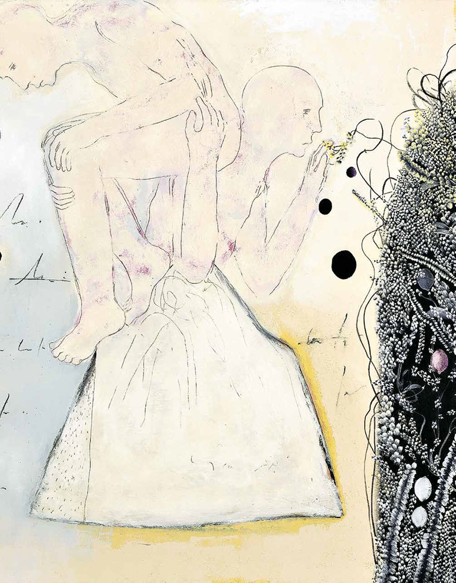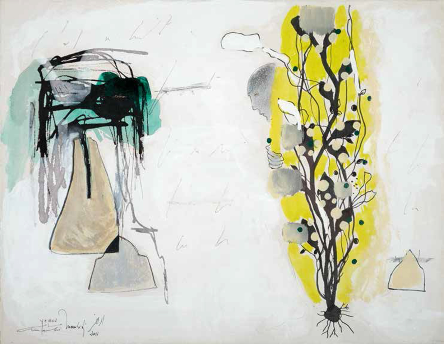 Yamou évoque souvent quand il peint en solo un Eden recréé dans la distance de l’imaginaire. Un Eden habité par les arbres et les plantes, les graines, les transparences de l’eau, aux couleurs d’estampes orientales. Il peint la matière du rêve métaphorique de la quête, du désir fou, de l’infiniment beau, l’infiniment juste si mal vécu sur la planète et dont il peut nous communiquer les vibrations de lumière. Ici, dans l’espace partagé avec son ami peintre, il retient les forces de l’imaginaire, ne laisse remonter que l’essence du monde intérieur, quelques éléments propres à accompagner sans s’imposer, des bribes, des bulles, des écritures. Choisissant d’être plus allusif que démonstratif de sa richesse potentielle, sa composition gagne en densité. Les corps de Mahi Binebine appartiennent à des Limbes auquel un destin tragique les assigne. Ne serait-ce qu’à cause de leur nature d’êtres mortels. Leur destin individuel les conduit également souvent vers la perte. Le tragique s’accentue au contact des ondes légères qui se dégagent du pinceau de Yamou, comme si le voyage en dehors de leur territoire assigné les rendait encore plus vulnérables et touchants. Les postures, l’expression des visages, sont significatives du drame existentiel dont la création déjoue les effets négatifs. Puisque à travers l’acte de peindre c’est la vie en action qui se manifeste. Dans la dialectique des énergies, la réalité lisible devient plus mystérieuse, complexe. Le déchiffrement exige la méditation.