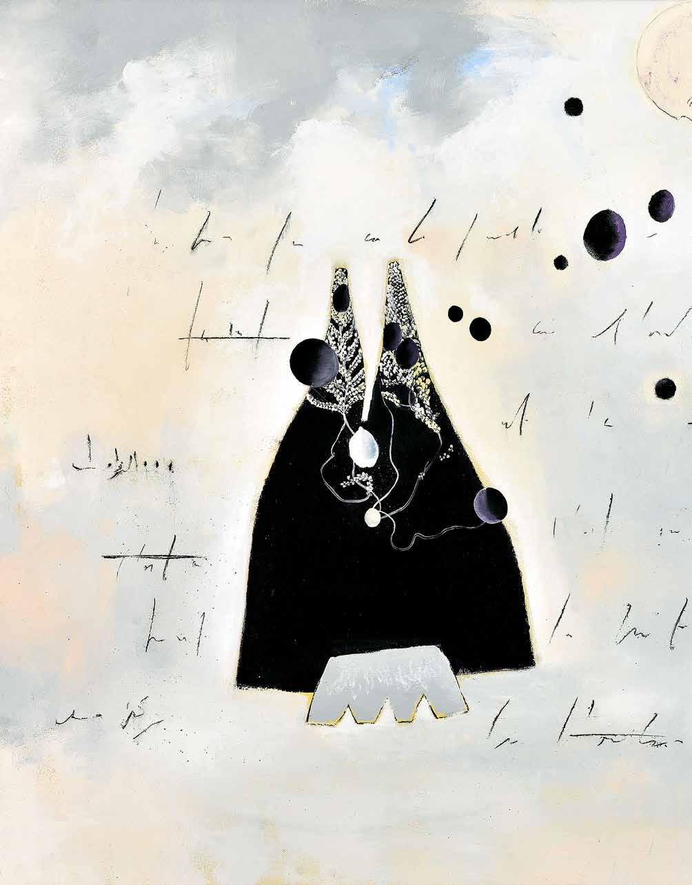 Mourabiti joue ses atouts dans le dialogue des formes et des couleurs, laisse les figures secondaires de son vocabulaire pour conserver ce qui est essentiel, relié à son histoire, celle de sa terre, de la mémoire de ses ancêtres, celle qui peut abriter aussi la vision du spectateur en quête de vérité universelle, de demeure éternelle pour sa faim d’éternité. L’origine y trouve sa finalité : La géométrie d’un toit, la blancheur d’une trace / désir / espérance. Mourabiti ramène les esprits à des symboles primordiaux qui tissent le lien entre l’irréalité de l’imaginaire et la réalité de la vie terrestre si bien représentée par la maison, ou plutôt le signe de la maison fondatrice à l’image de l’igloo, du temple, du tipi, dans l’esprit de Merz ou de Beuys. Formes emblématiques qui surgissent dans l’espace de la peinture en duo ou en trio, ouvrant des accès à d’autres pistes, des chemins insoupçonnés posant des questions, ou donnant des réponses aux interrogations légitimes du spectateur. Dans l’exécution de leur partition, chacun des artistes amplifie la formule la plus riche de sa langue, de son répertoire, tout en respectant la partie engagée par l’autre, lui cédant de l’espace pour une vraie conversation de signes, de rythmes et de couleurs. Tous les trois excellent dans ce jeu d’effusion et de retenue.