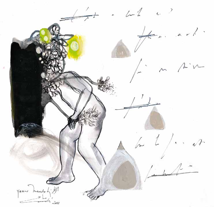 Optant pour l’espace et la lumière, dans l’esprit d’une fratrie indissociable, ils se sont si bien vus, parlé, reconnus, chacun dans son aire, qu’ils ont eu le désir de tenter de « jouer » ensemble comme dans un trio musical, le piano avec le violoncelle et le violon. La partition est à écrire. Et comme ils ont, selon la formule de Picasso parlant de Matisse, le soleil dans le ventre, ils ont inventé une œuvre rayonnante. Aucun d’eux ne s’est perdu dans l’harmonie du chant, au contraire, les inventions se sont trouvées renforcées et les faiblesses écartées, à l’aune d’une confrontation constructive. Dans le champ du monde de Yamou, expression de la rêverie du repos, Binebine projette les silhouettes du silence. Les hommes et les femmes pris dans l’Aventura. Il y a dans l’univers de Mahi Binebine la même tension entre le désir de vie et la présence de la mort que dans le film d’Antonioni, transcrite par des moyens visuels. L’homme est littéralement « embarqué » et les figures du destin sont tour à tour angéliques ou démoniaques. Son écriture est résolument moderne, comme le sont les dessins courant en frise sur les vases puniques ou grecs. Sorte de filiation intemporelle que l’on retrouve chez plusieurs grands créateurs de notre siècle.